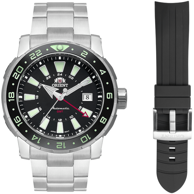 Pulseira: Aço inoxidável com pulseira adicional em borracha, largura de 24 mm